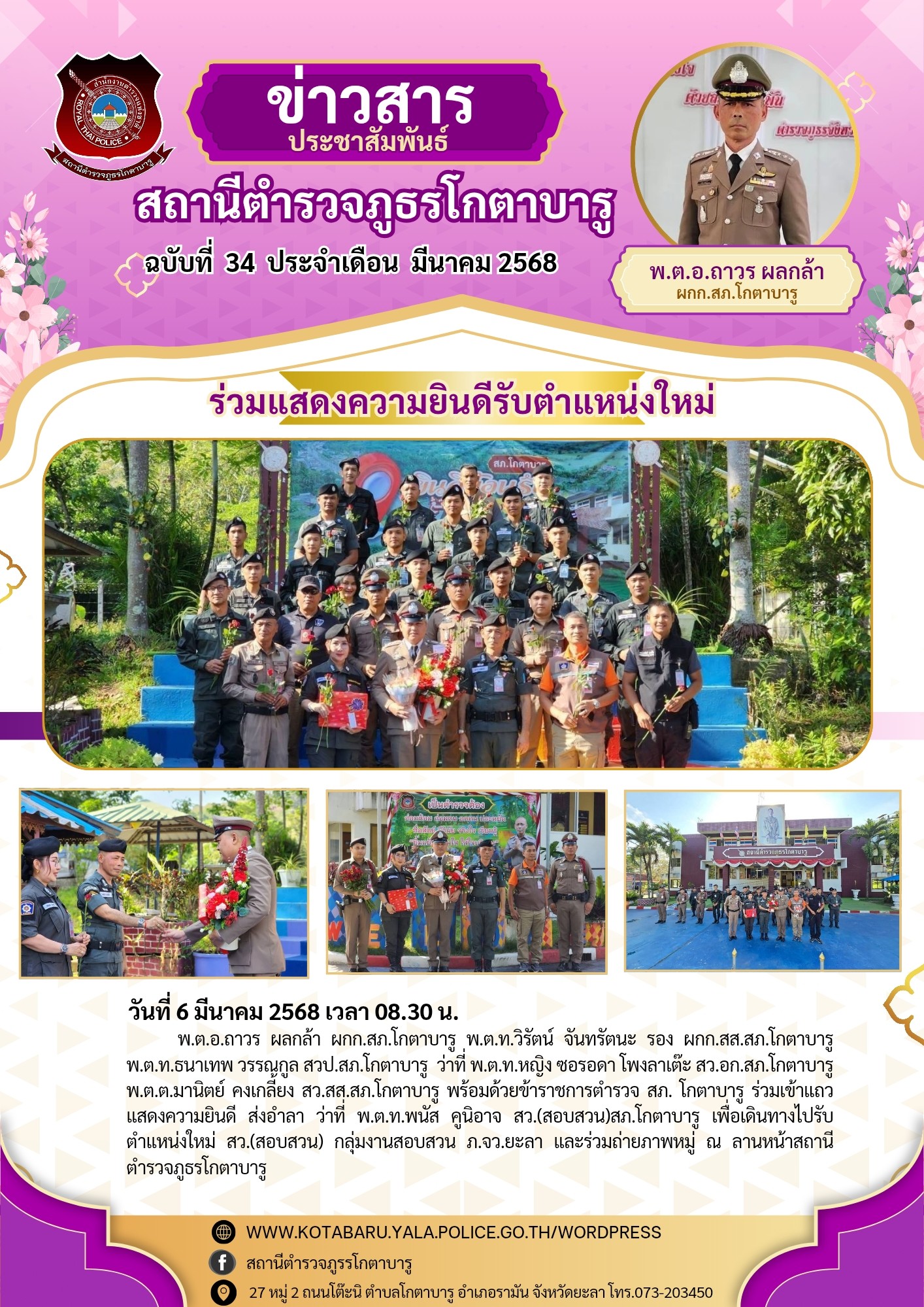 วันที่ 6 มีนาคม 2568 เวลา 08.30 น. พ.ต.อ.ถาวร ผลกล้า ผกก.สภ.โกตาบารู พ.ต.ท.วิรัตน์ จันทรัตนะ รอง ผกก